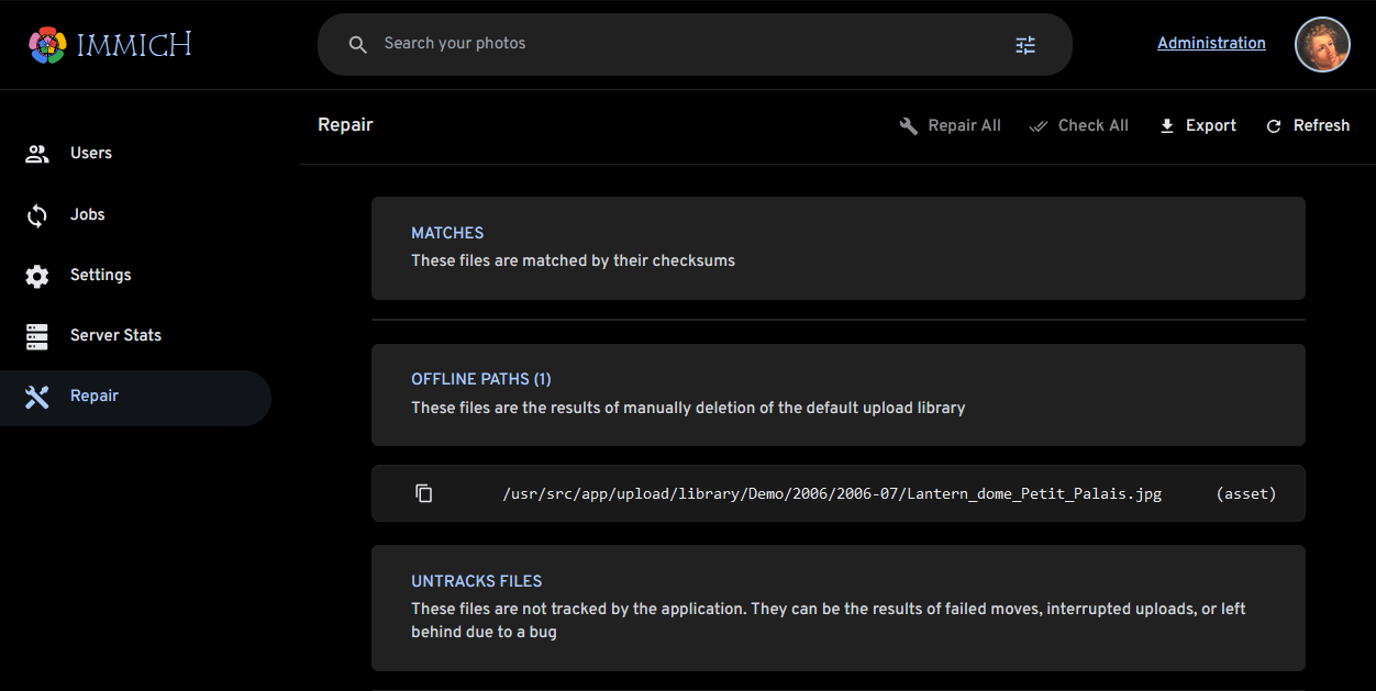 The repair page is designed to give information to the system administrator about files that are not tracked, or offline paths.